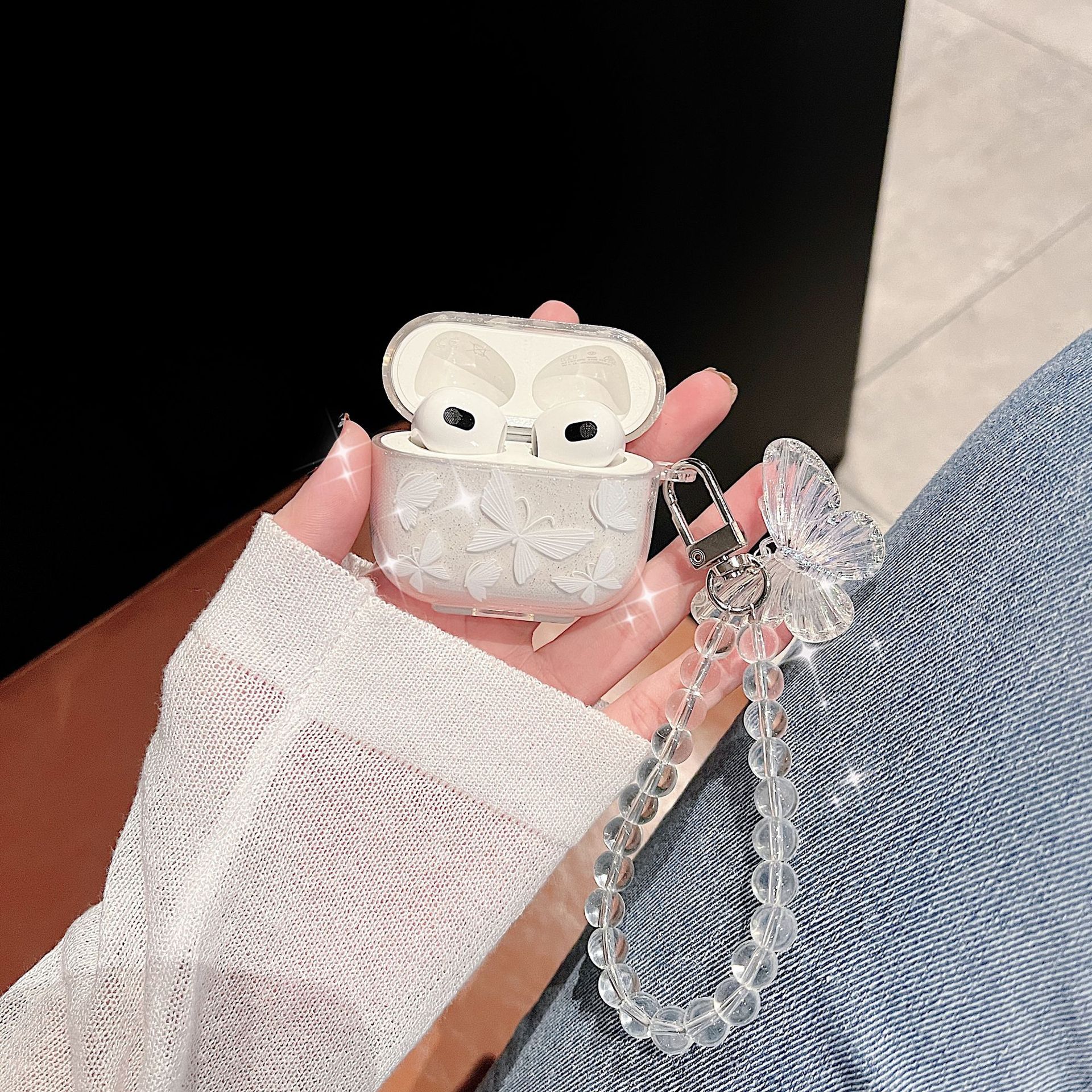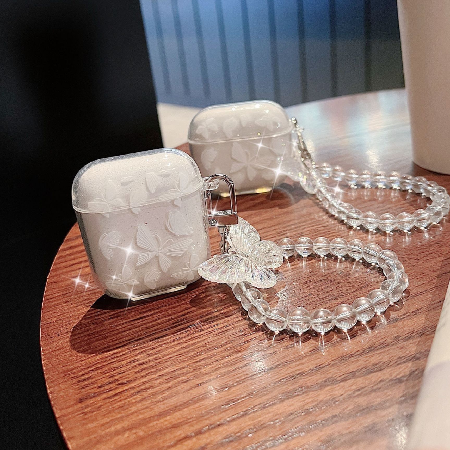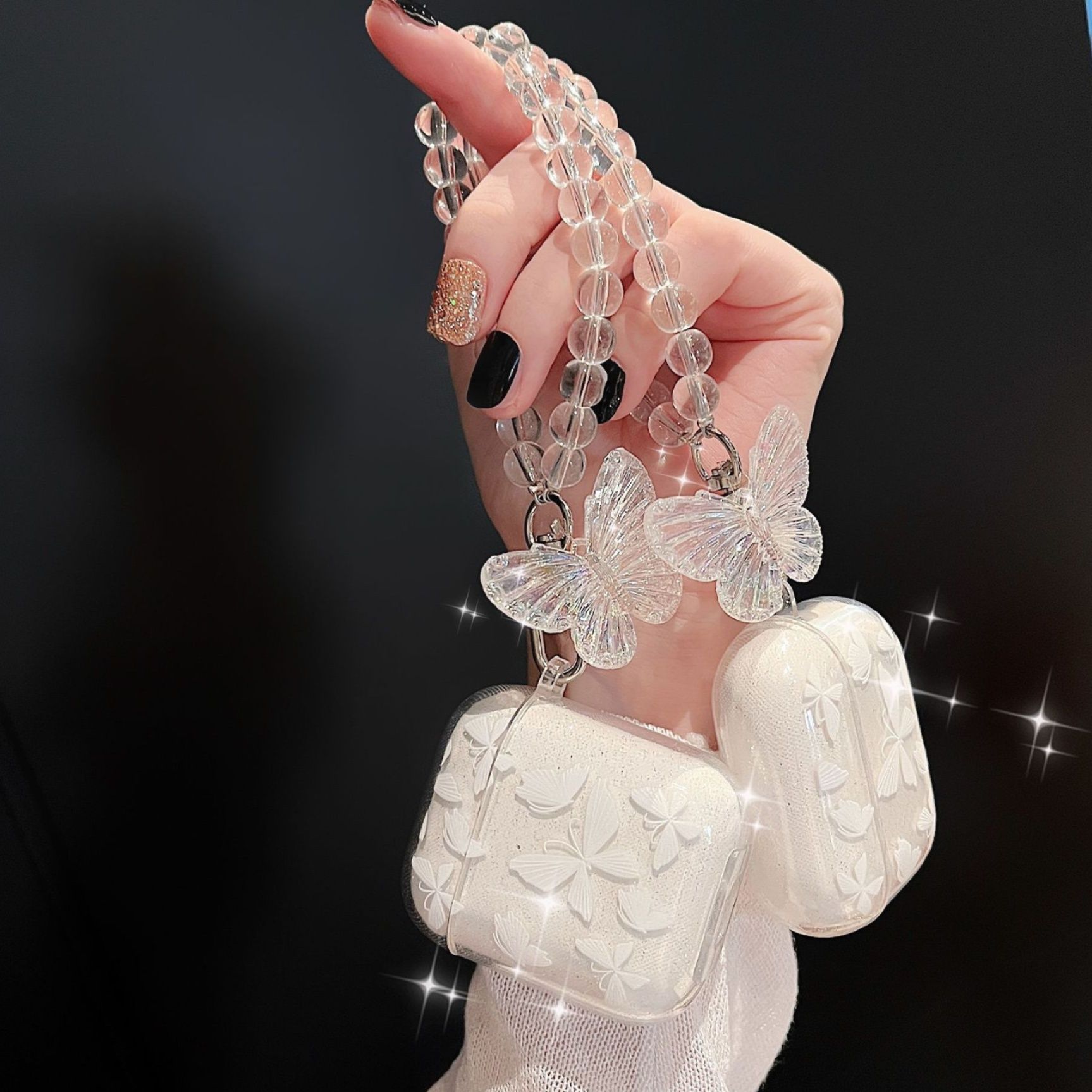 大きな蝶々チャームとクリアビーズのストラップが付属し、持ち運びにも便利です。