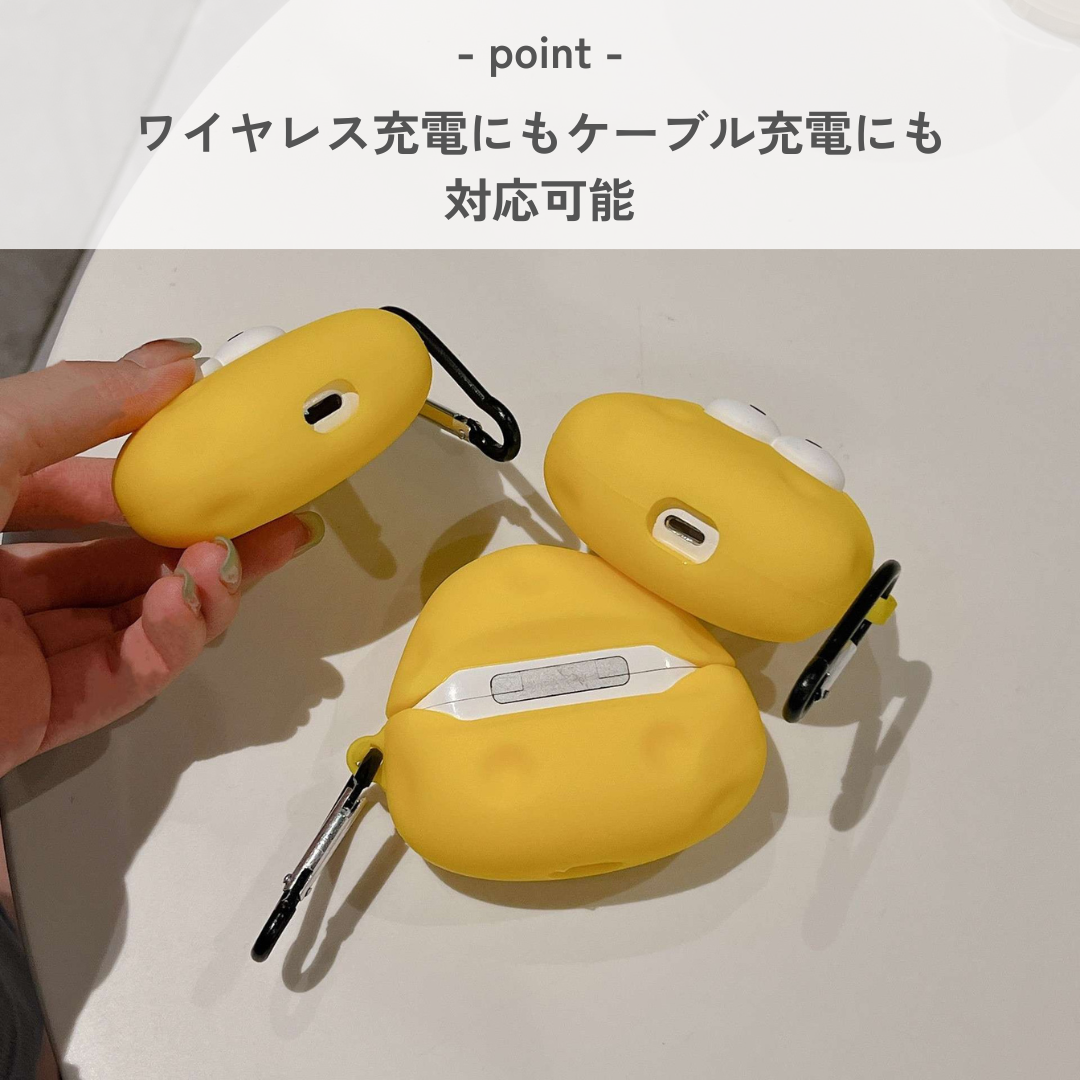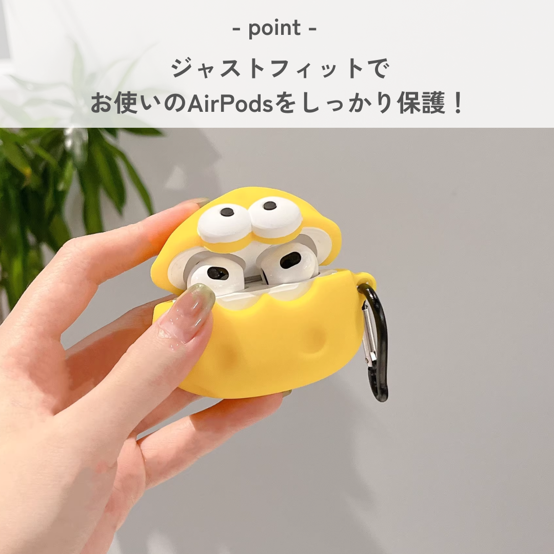 ユニークな大きな目玉が印象的なチーズ型AirPods Proケース。柔らかいシリコン素材を使用し、しっかりとした保護力を提供します。カラビナ付きで持ち運びも楽々、開閉式のデザインでAirPods Proの出し入れもスムーズに行えます。可愛らしい見た目で、どんなシーンでも注目を集めること間違いなしのアクセサリーです。おしゃれに音楽を楽しむための必須アイテム。