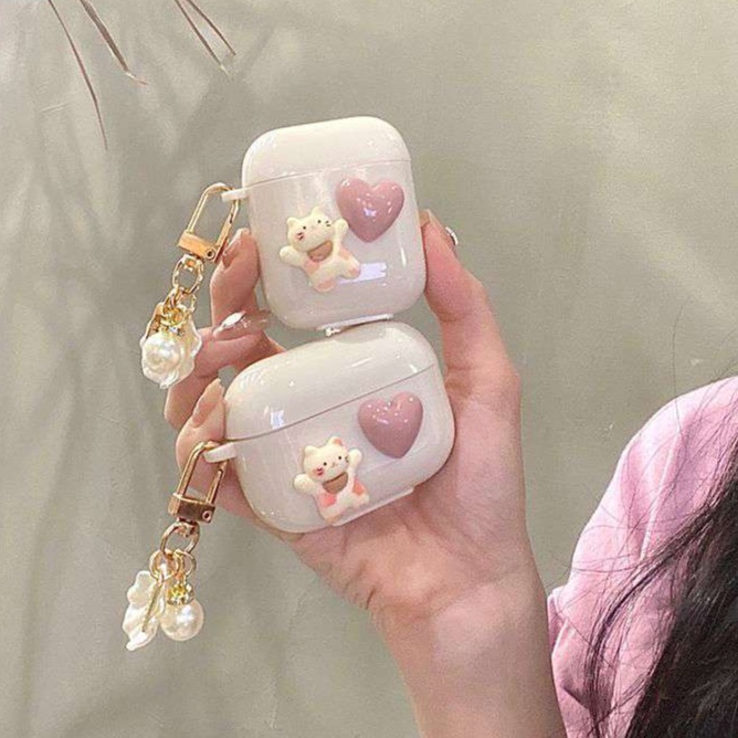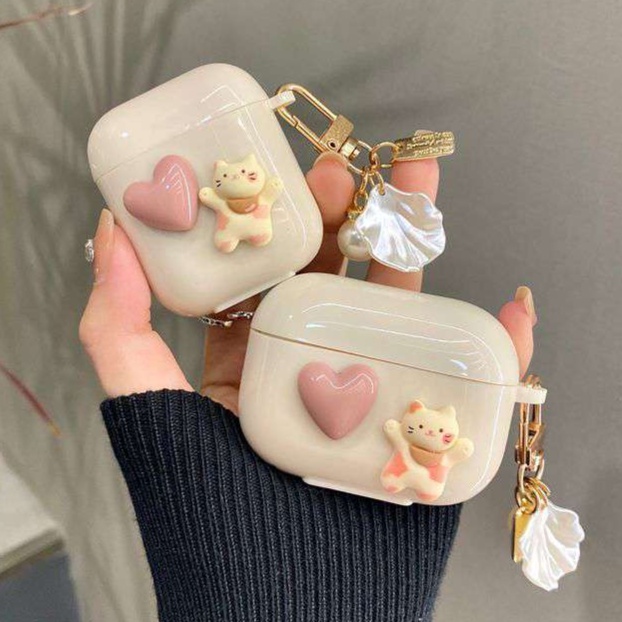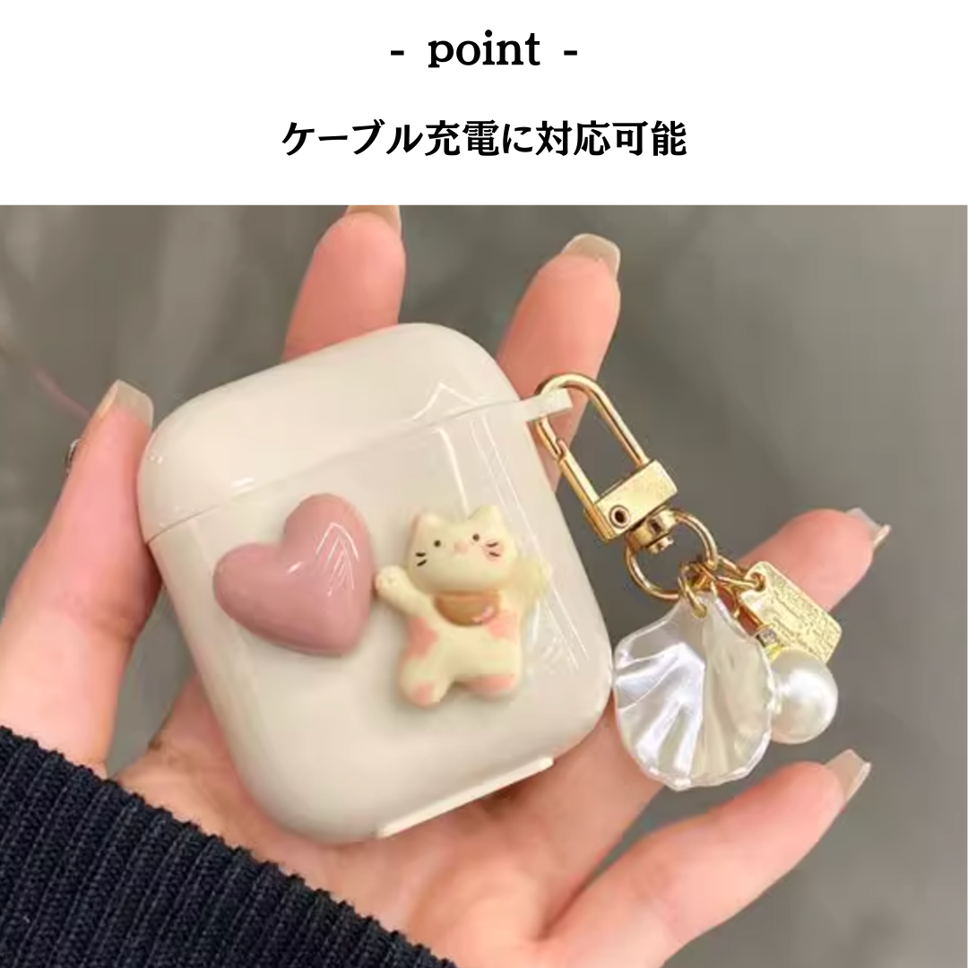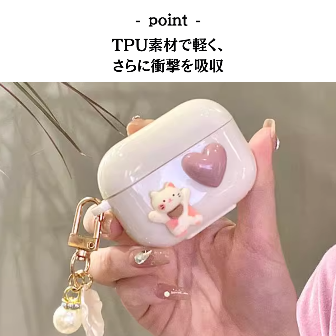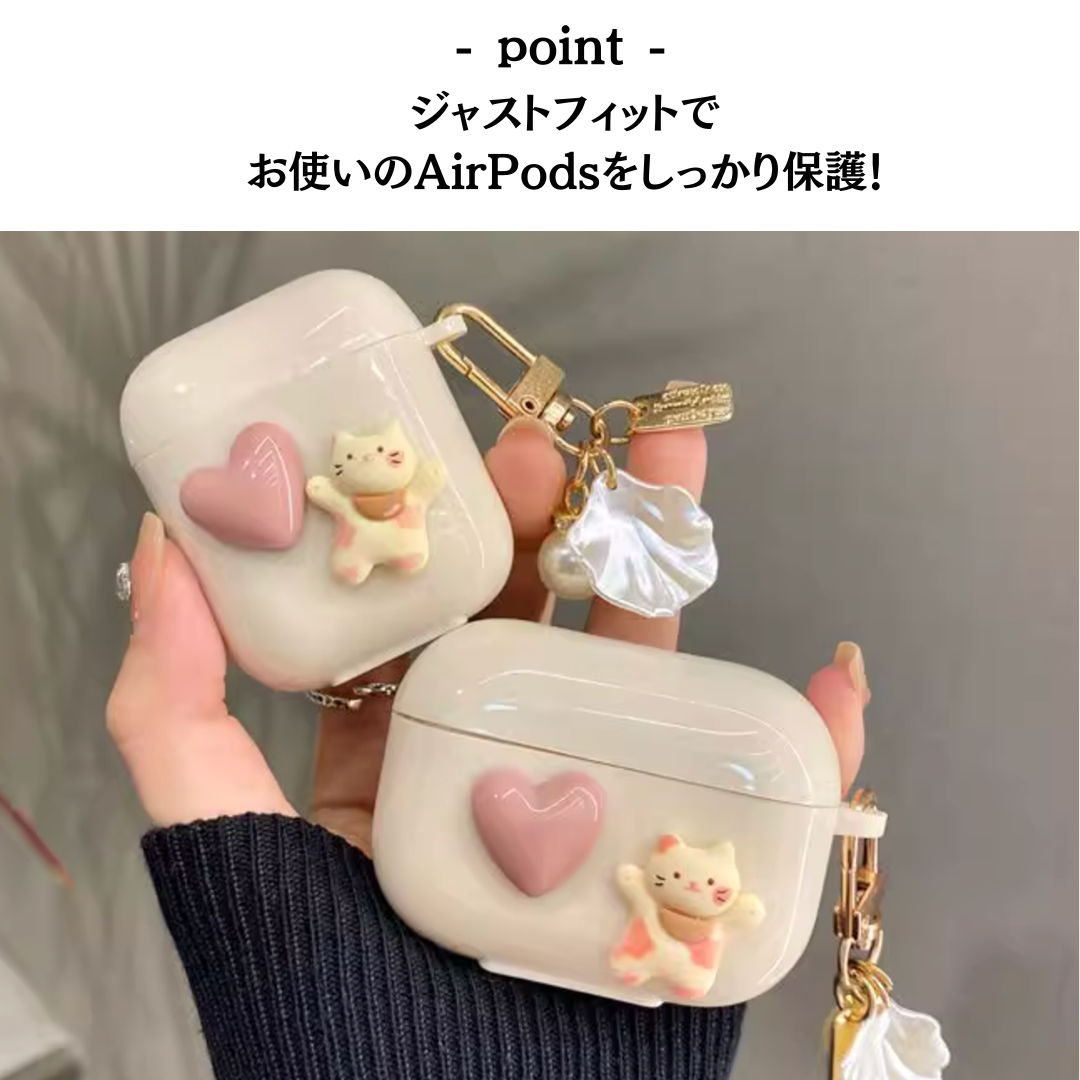 ハートとねこの立体装飾が特徴的なAirpodsケース。Pro対応の保護カバーで機能性も充実。