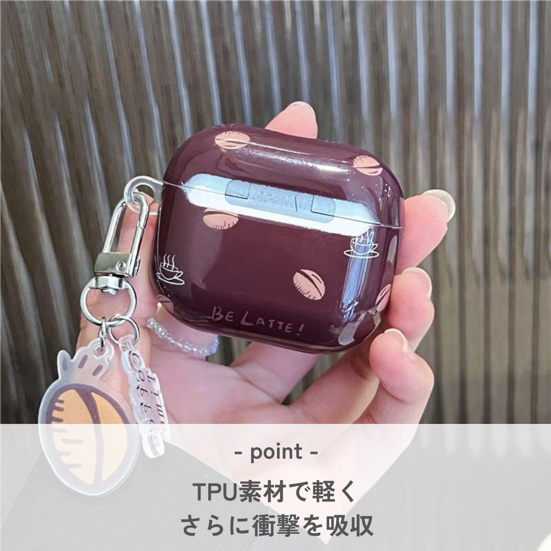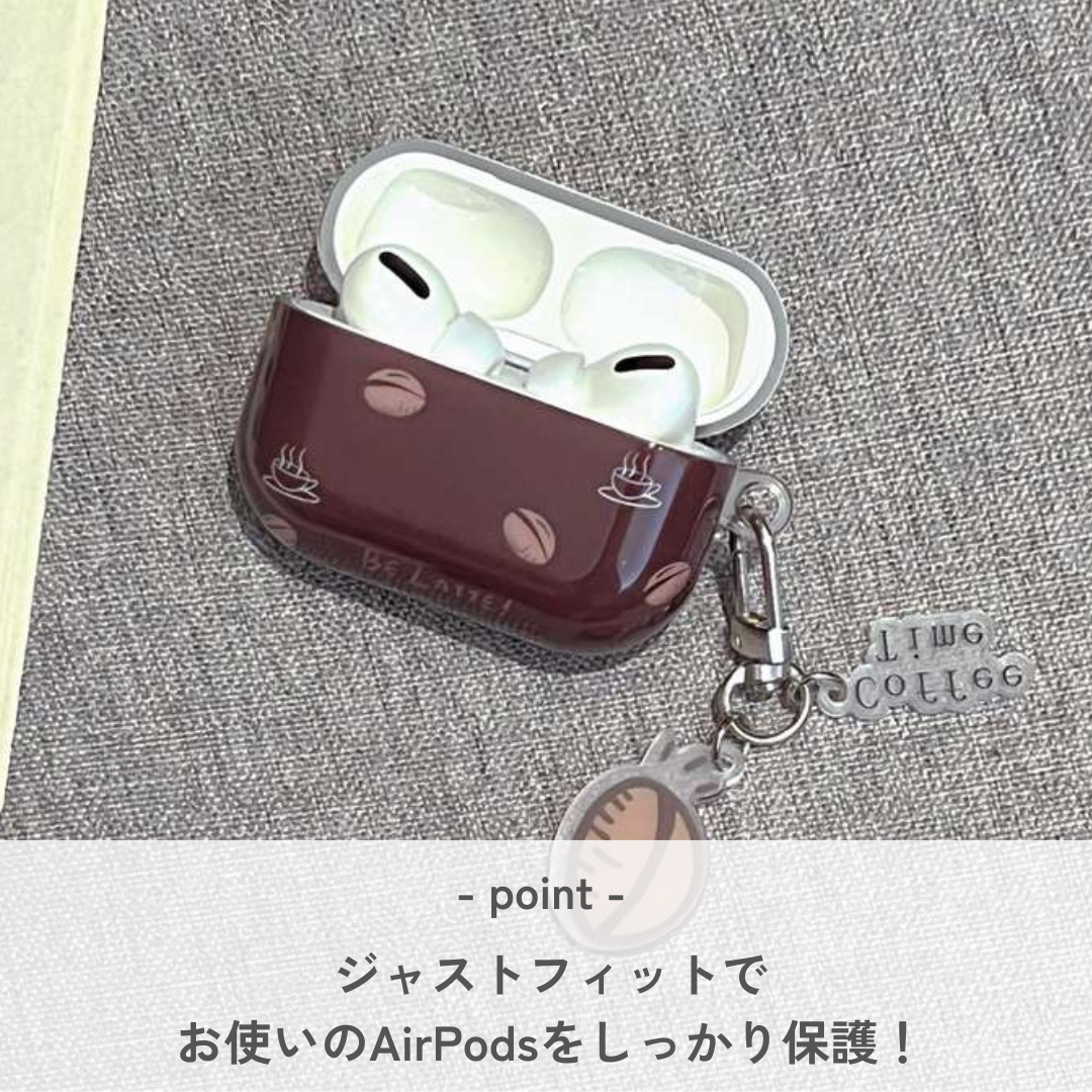 コーヒー豆とカップのイラストがおしゃれなAirpodsケース。耐久性に優れた素材で作られており、AirPods Proにも対応。