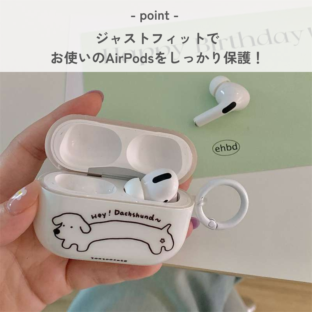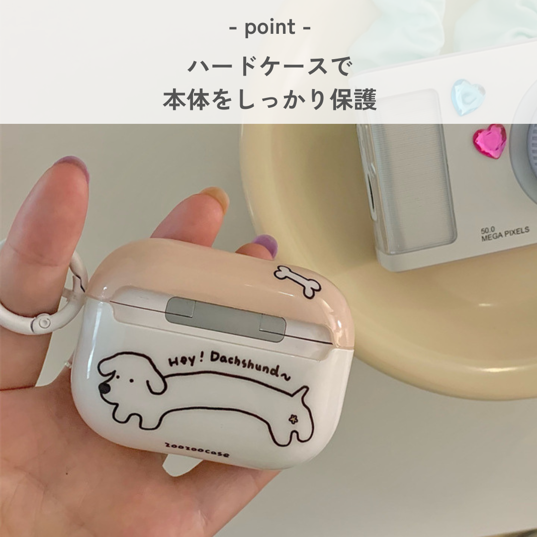 ダックスフンドの愛らしいイラストが施されたAirPods Proケース。細長い体と骨型アイコンが特徴的で、可愛さと実用性を兼ね備えたデザイン。犬好きにはたまらないアイテムで、AirPodsをしっかり保護しながら日常使いにも最適。おしゃれを楽しみつつ、大切なAirPodsを守るための完璧な選択です。
