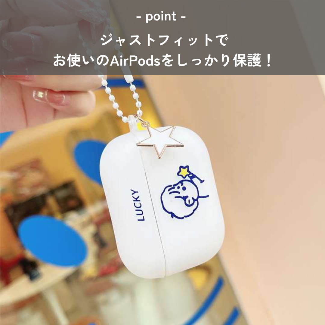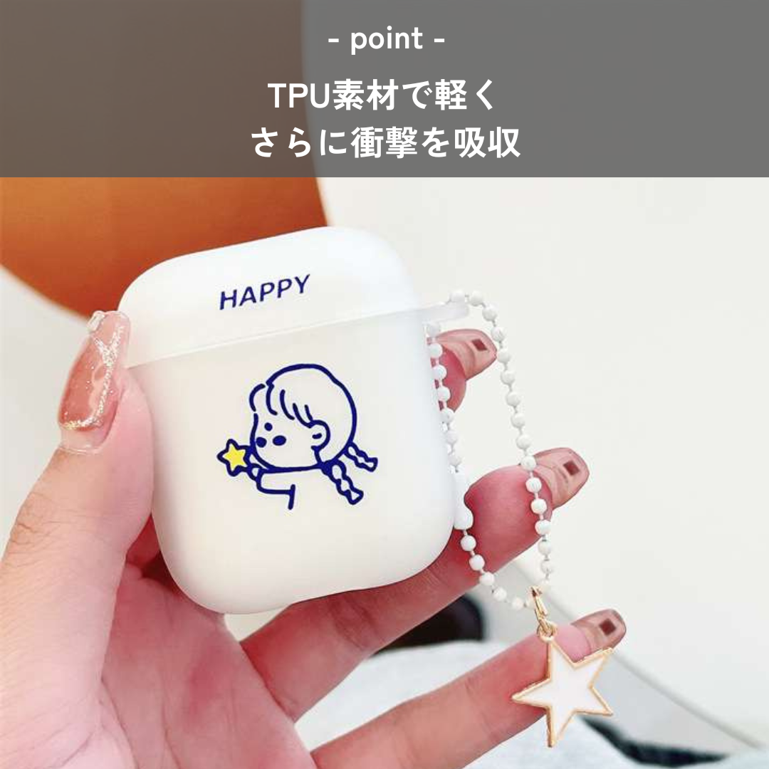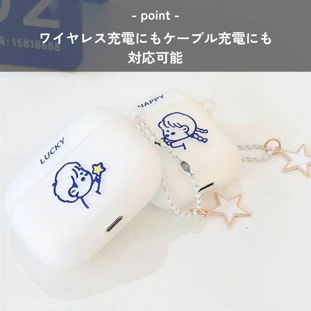 かわいい星を持つ子供のイラストが描かれたAirPodsケース。幸運を呼び込む「幸運」の文字と星のチャームつき。