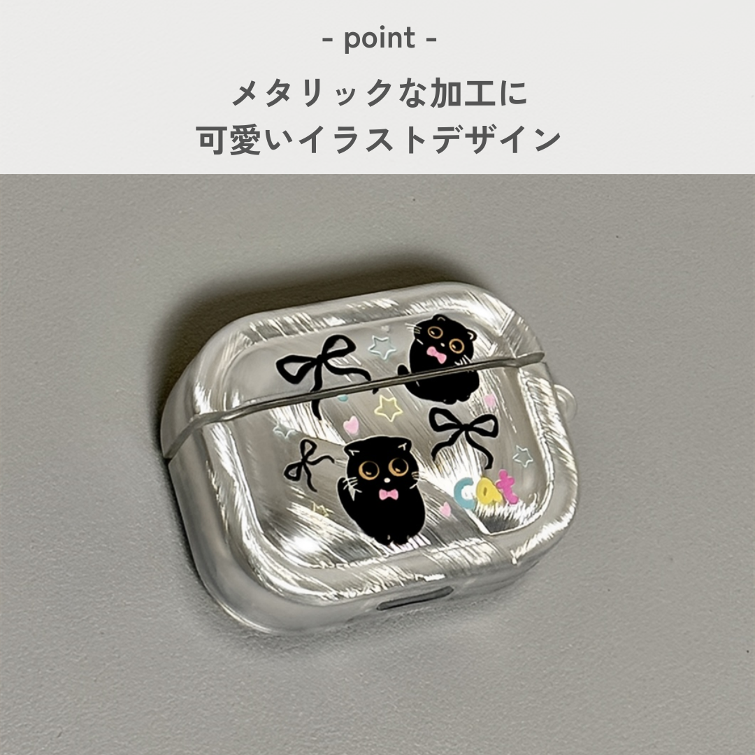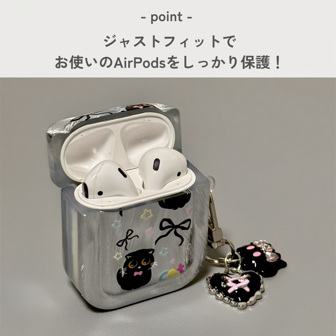 愛らしい黒猫とリボンのデザインが魅力的なAirpodsケース。透明な本体に猫やリボン、星などのモチーフがプリントされ、かわいさと機能性を両立。