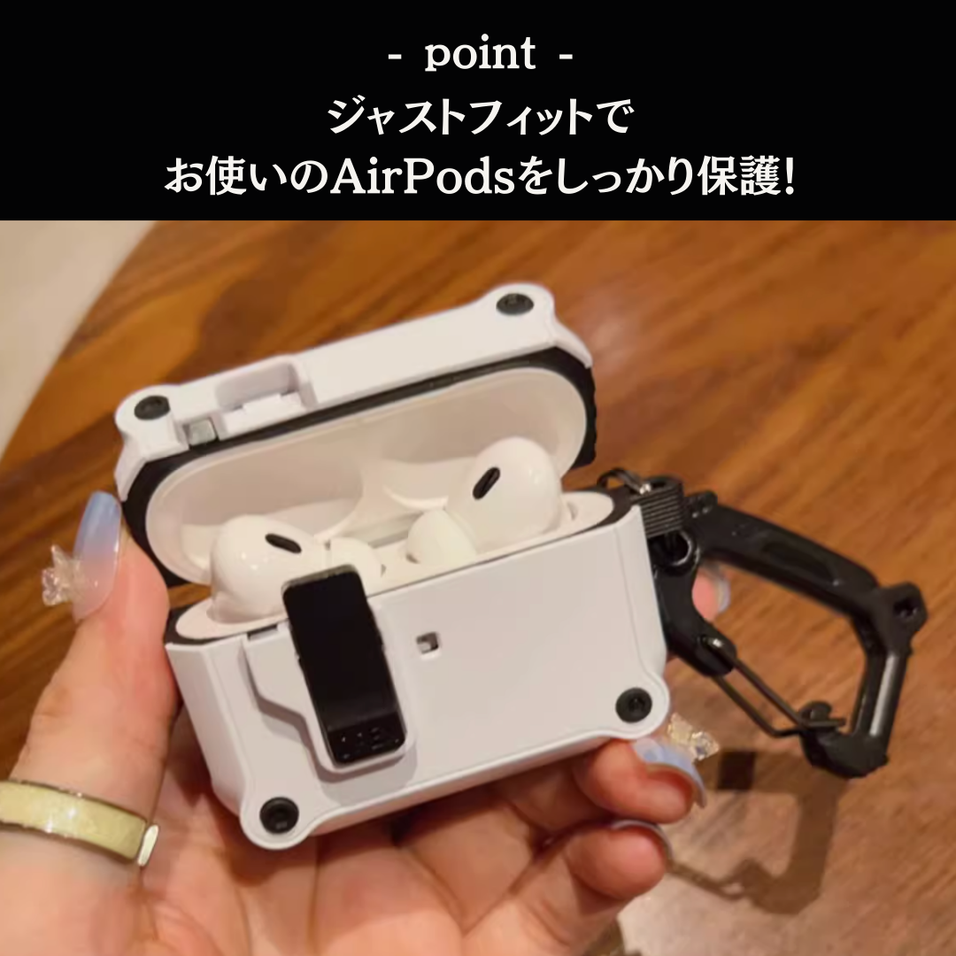 工業的なデザインと堅牢な作りで、衝撃や傷からしっかりとAirPodsを守ります。