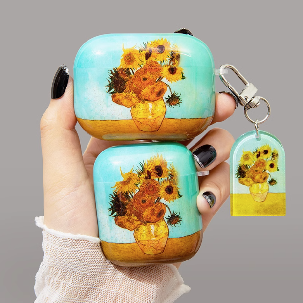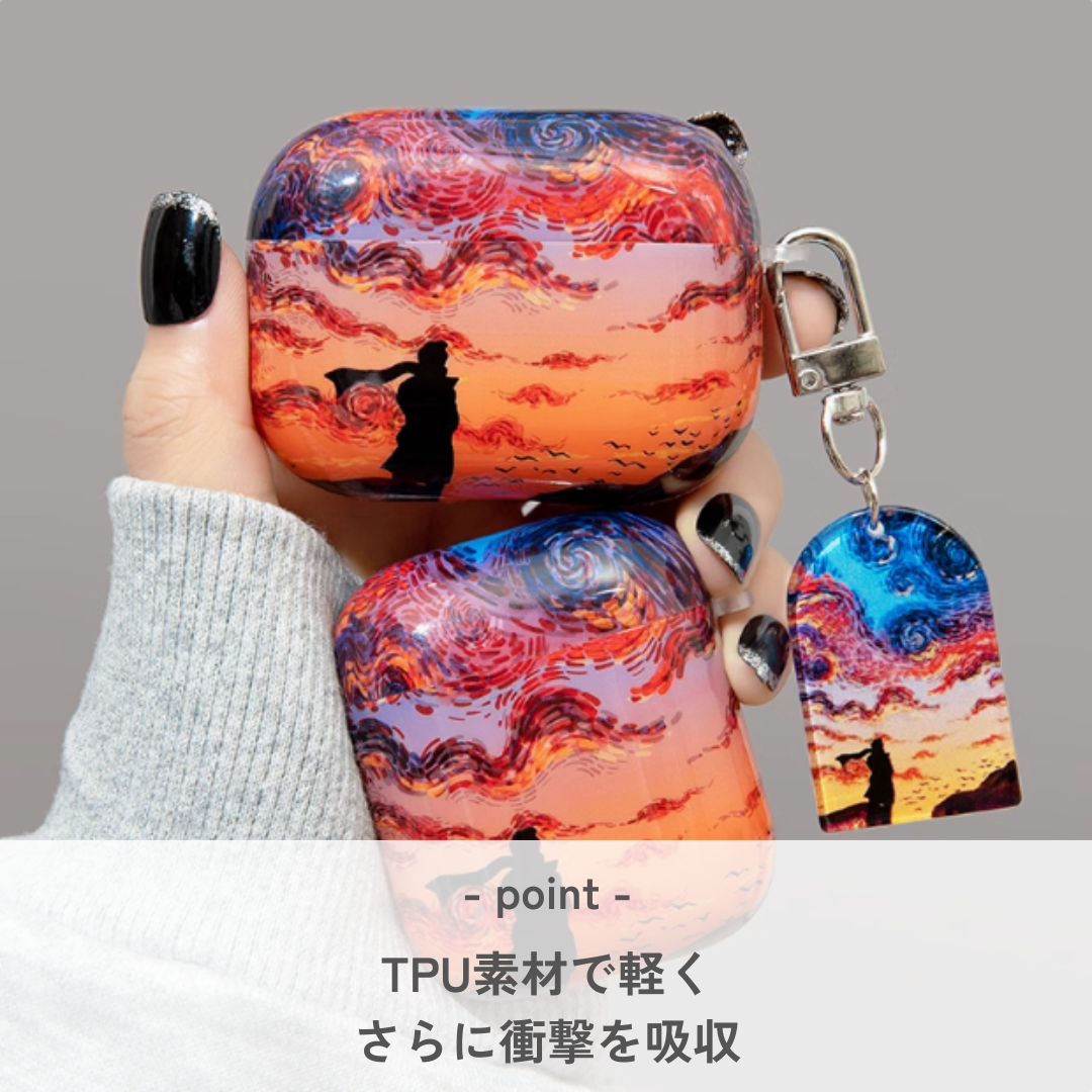 レディース向け幻想的なAirpodsケース。星空と城の絵画モチーフが全面に広がり、芸術的な雰囲気を演出。