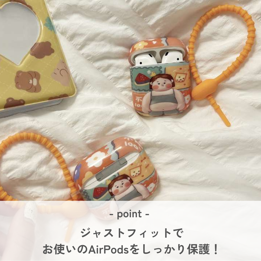 懐かしい絵本のような可愛らしいイラストが特徴のAirpodsケース。チャーム付きストラップで持ち運びも便利です。